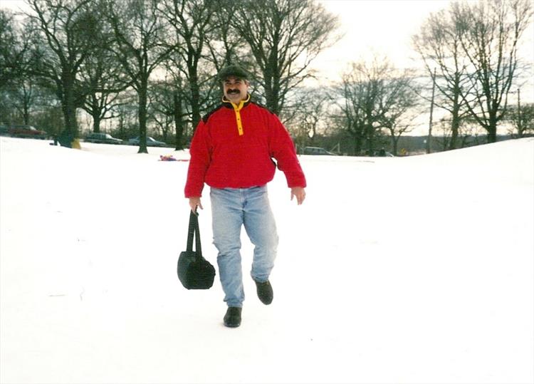 With video camera to tape his kids sleighriding 1996